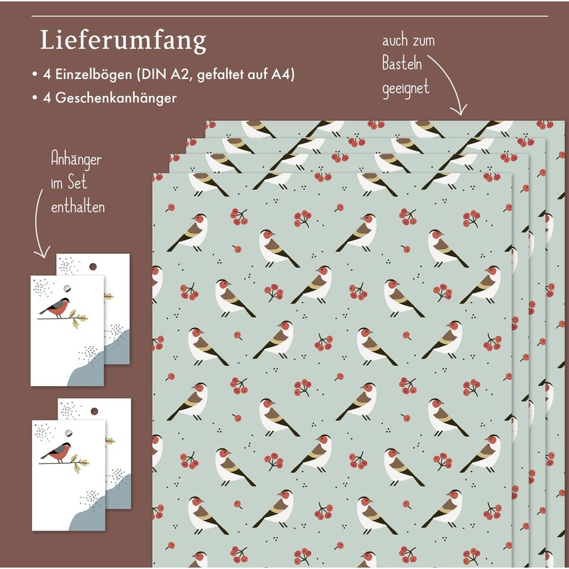 dabelino® Christmas wrapping paper "birds/berries": 4 x sheets + 4 x pendant set (environmentally friendly, sustainable, eco-friendly, modern, elegant, recycled, for adults, birthday)