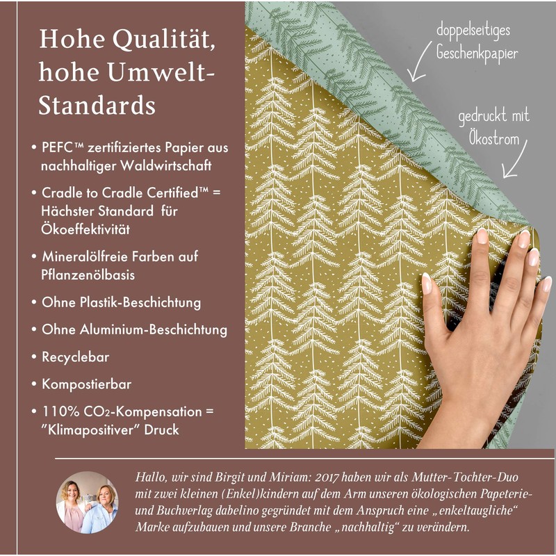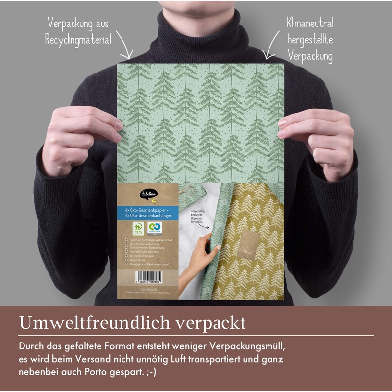 This environmentally friendly premium wrapping paper for adults from the ecological stationery startup dabelino looks particularly modern and elegant with its Christmas tree line drawings. This is also ensured by the carefully selected and harmonious colour combination in green and brown shades. A set of four sheets (each DIN A2 = approx. 42 x 59 cm, folded to A4) with four matching gift tags.