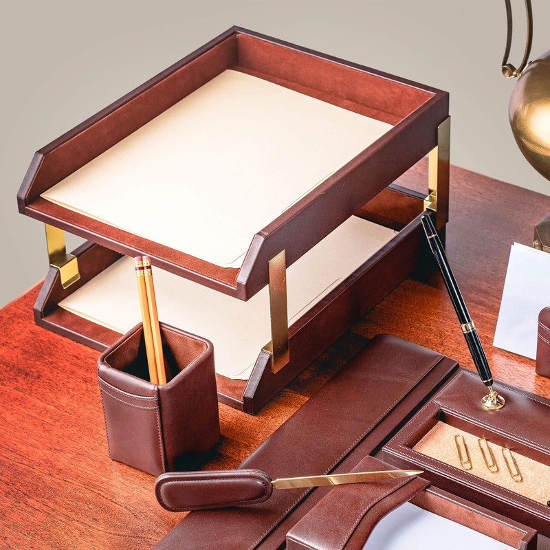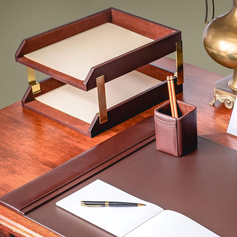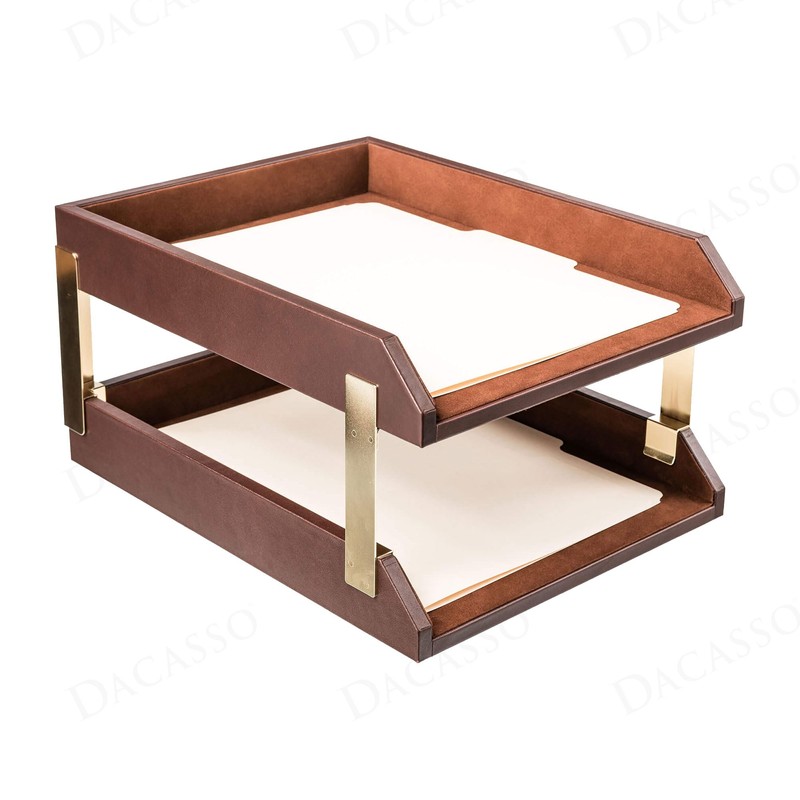 - LUXURY ADDITION TO THE OFFICE SETTINGS: This chocolate brown letter tray stacking set is expertly made with top-grain leather. From the soft, supple surface to the fine stitching and precise edges, this handcrafted desk paper organizer is created with the utmost care and attention to detail.