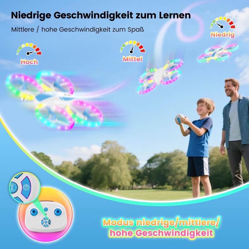 - Colourful light effect toy RC drone: this RC drone can bring great fun to both adults and children. The four protective frames of the quadcopter are equipped with colourful LED lights - 5 light effects to switch. When the drone floats, it can perform a 360° flip show. 3 speed modes to meet the needs of players with different skills. It's time for a flight adventure