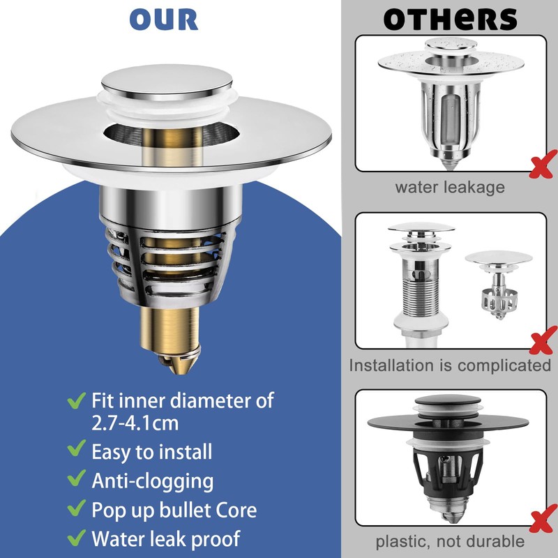 • Two-mode switch: the pop-up design of this drain strainer tilts the uncomfortable way of drainage. It is 2 in 1 bath plug and filter. Simply gently press the top cap down to switch 2 modes, including holding water and draining water. Unlike conventional drain plugs, our sink drain plugs are equipped with an anti-clogging basket filter that collects hair cleanly and prevents clogging of the drain pipe, and necklaces and rings do not have to worry about flowing into the sewer.