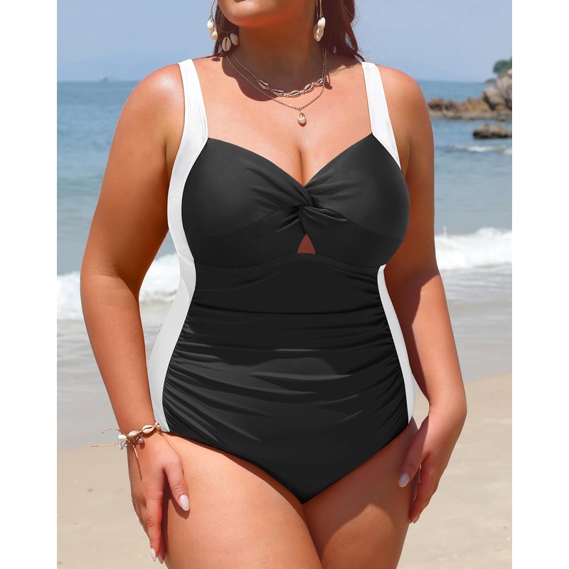 Daci Women Plus Size One Piece Swimsuits - Tummy Control Bathing Suits Full Coverage Twist Front Ruched Swimwear 2025, Black and White, 22 Plus