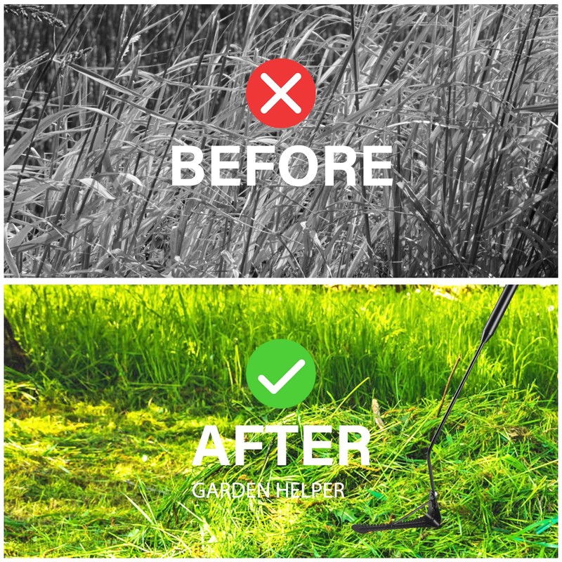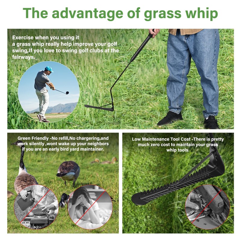 - 【Easy to Use Yard Tools】A grass whip is quite simple to use. Hold the grass whip like you would a golf club,and swing back and forth. You can almost pretend you're hitting a golf ball while using, as that's the same motion you'll want to use when clearing weeds. This blade works both ways, so make sure to save yourself some labor and swing it in both directions. Trim weeds, get some excercise as well improving your golf swing.