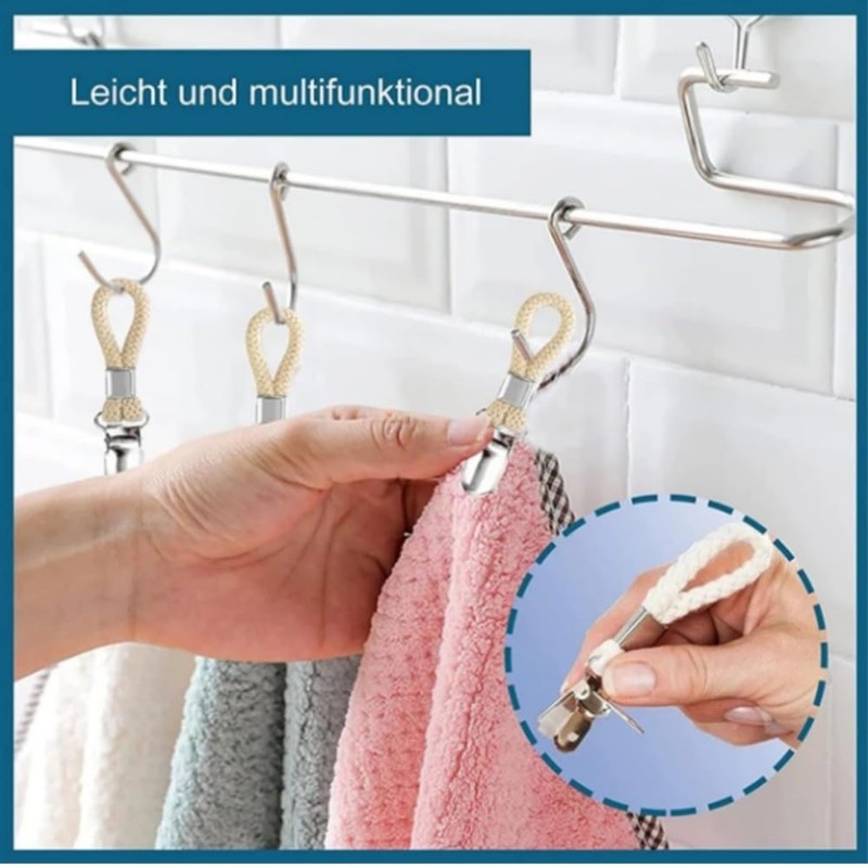 - 【Usesusos múltiples】:este clip de cuerda de algodón se puede utilizar en el hogar. El cordón de metal y algodón garantiza que la toalla se mantenga firmemente en su lugar y evita que las superficies se rayen. El clip de toalla de algodón se utiliza principalmente para colgar toallas, toallas de baño, asas, herramientas de cocina u otras herramientas de cocina, etc., tiene una buena versatilidad, es una buena herramienta para ahorrar espacio en casa.