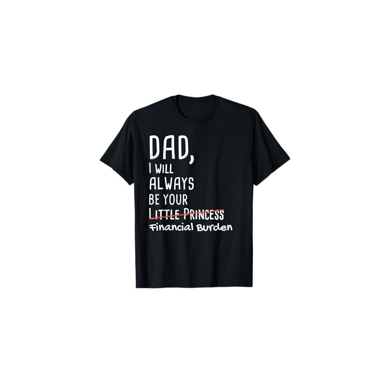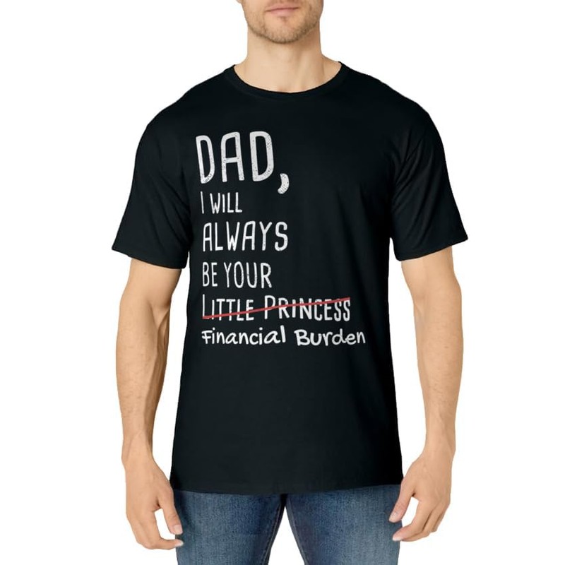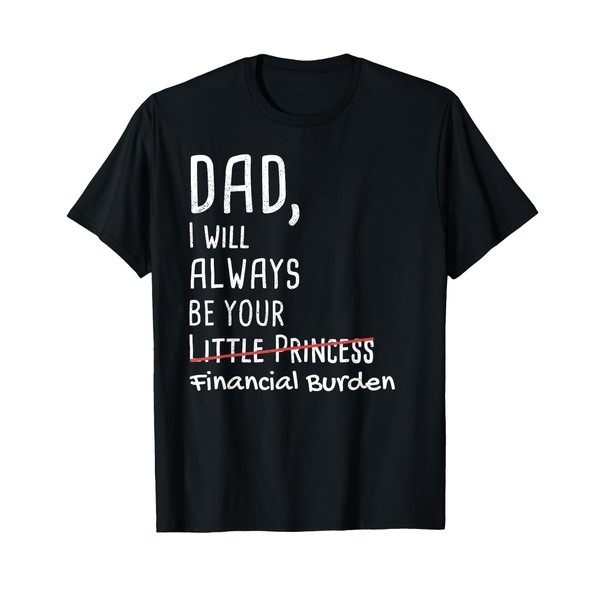 • As daddy of a daughter, your little girl will always be your princess & you love her. But she likes spending money for shoes & clothes and you have to pay? The T-Shirt has a funny pun saying DAD, I WILL ALWAYS BE YOUR LITTLE PRINCESS - FINANCIAL BURDEN