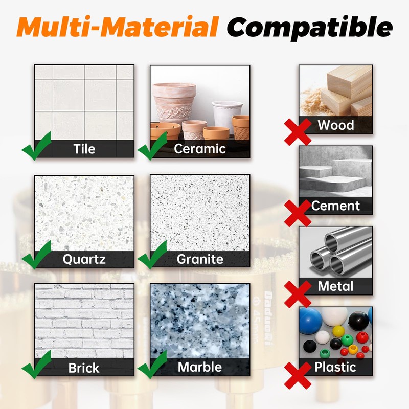 - 【Upgraded High Quality】Compared to standard diamond hole saws, our newly diamond bits features sharper serrated edges and coarser diamond grit. With an enhanced diamond coating, a more robust one-piece steel body, and advanced double-layer surface treatment, it ensures durability, aesthetics, and wear resistance