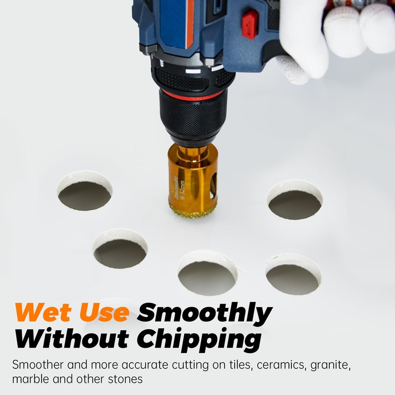- 【Wet Use for Optimal Performance】The electroplated diamond coating on this 4 inch hole saw for tile demands continuous use of water or coolant during operation. This requirement ensures the maintenance of a smooth cutting edge, prevents chipping, and enhances the diamond tile drill bit's longevity and sharpness, making it a reliable choice for demanding drilling tasks