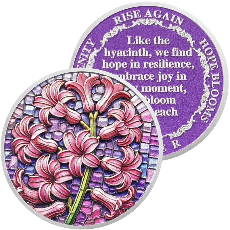 - 🌅Inner Meaning: The back of the coin is adorned with a calming purple background, encircling a prayer that draws inspiration from the hyacinth. The prayer speaks of finding hope in resilience, embracing joy in every moment, and blooming afresh each day, symbolizing the ongoing journey of healing and renewal in sobriety.