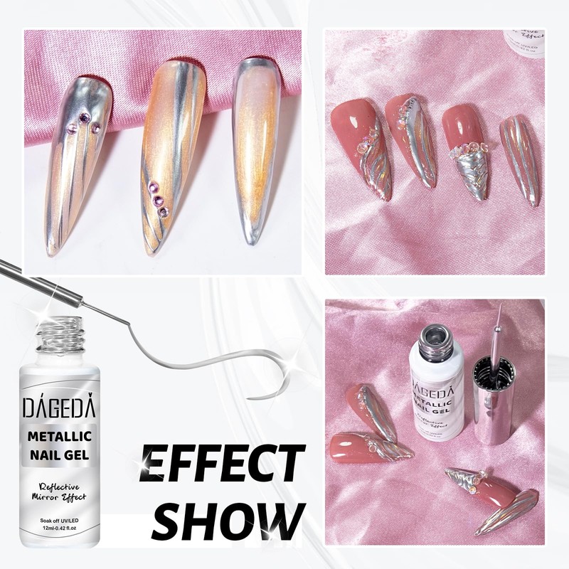 DAGEDA 12ml Metallic Nail Painting Silver Gel Liner,Mirror Gel Polish Build in Thin Brush,Chrome Gel Nail Polish High Gloss Nail Painted,Metal Drawing Liner Gel Soak Off UV/LED DIY Nail Art