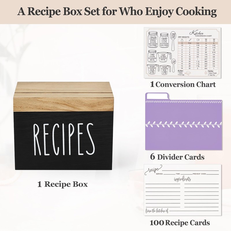 - Recipe Box Set Included: Our small Black and Brown Recipe Organizer measures 6.9x4.3x5.3 inches and has ample storage for recipe cards. The wooden recipe box comes with 100 pieces of 4x6 inch recipe cards, 6 dividers, and 1 conversion chart, allowing you to conveniently write in your own personalized recipes