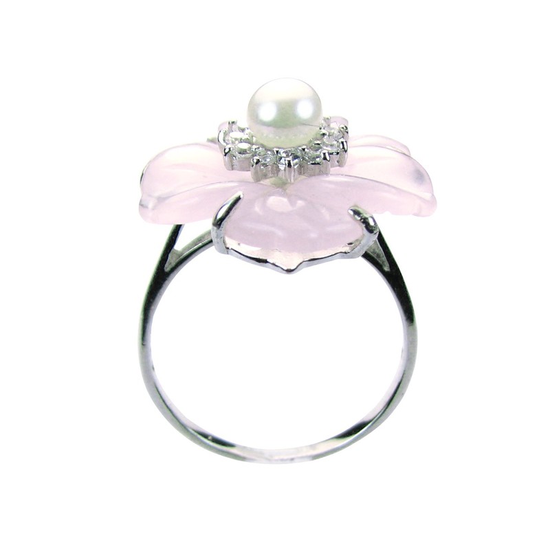 - Simulated rose quartz flower pendant and ring accent with a cultured pearl surrounded by cubic zirconia in the center