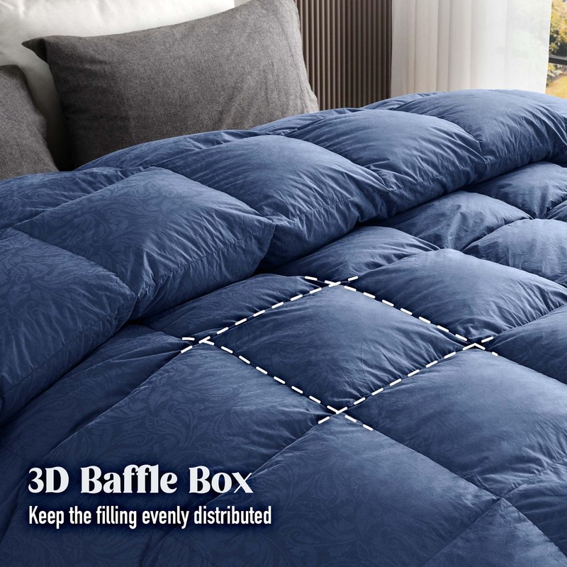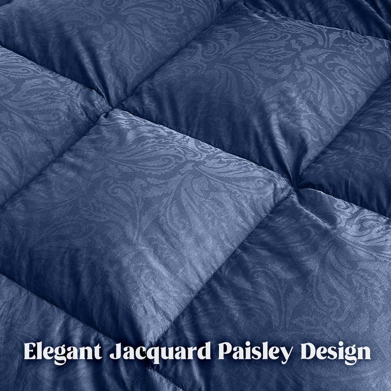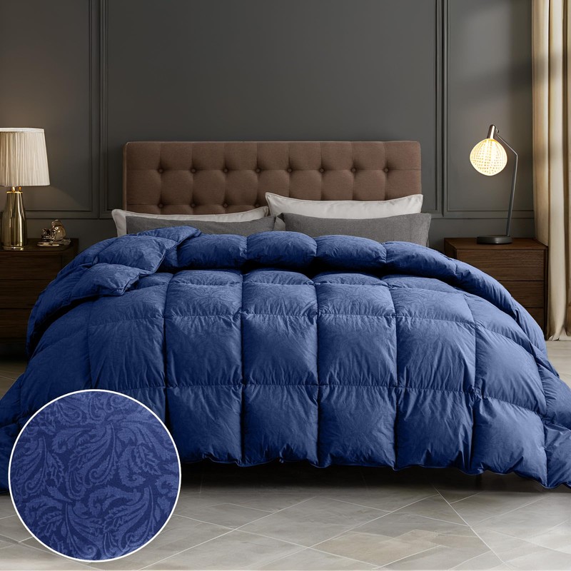 DAICO Goose Feather Down Comforter Queen Size, All Season Luxury Hotel Fluffy Duvet Insert, Ultra Soft 100% Cotton Shell with 8 Corner Tabs, Paisley Design (90x90'', Navy Blue)