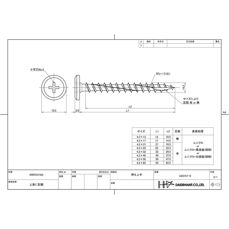 - L: 13mm Head Diameter: 10.5mm Material: SWRCH18A Bit: Cross No.2