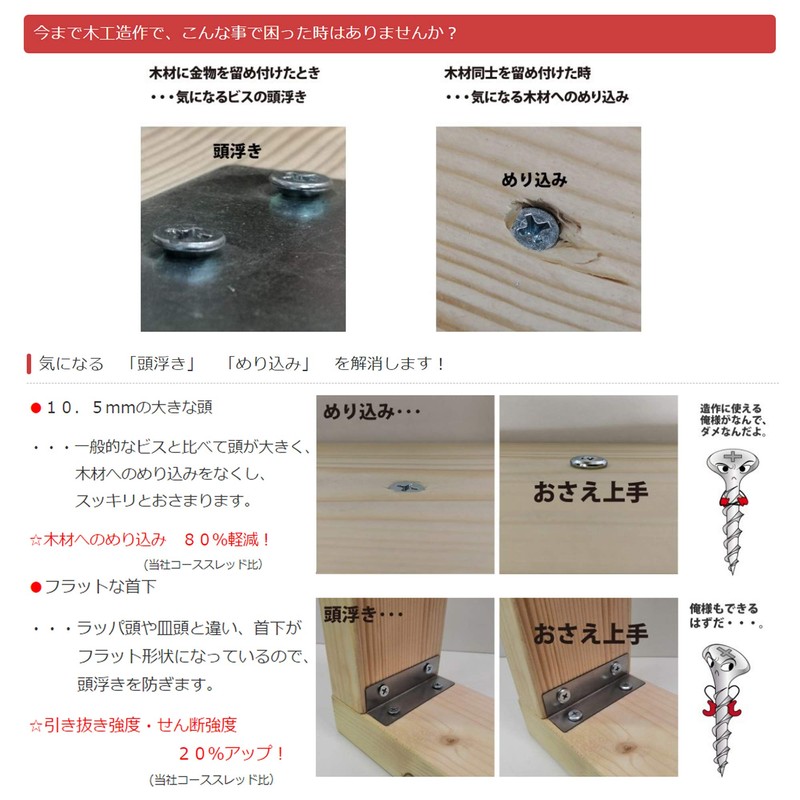 - Large head holds it firmly in place. Course threads are ideal for fastening hardware such as reinforcements and preventing them from sliding when clamping between wood