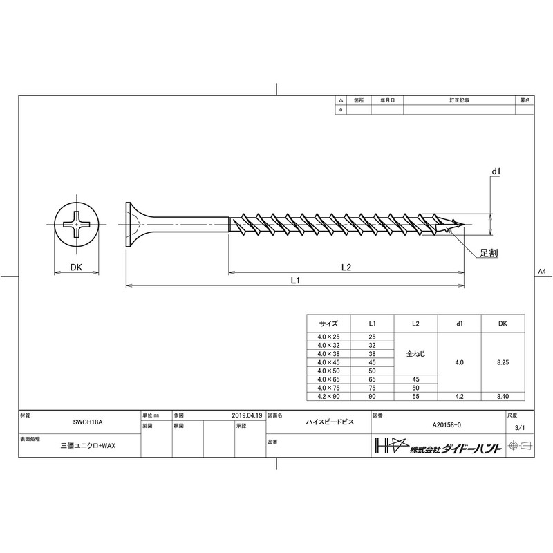 DAIDOHANT 10176872 High Speed Screw (Nominal Diameter d) 0.16 x Length 1.5 x Length 1.5 x Head Diameter D 0.3 inches (8.25 mm) Iron / Trivalent Uniqlo, Approx. 100 Pieces