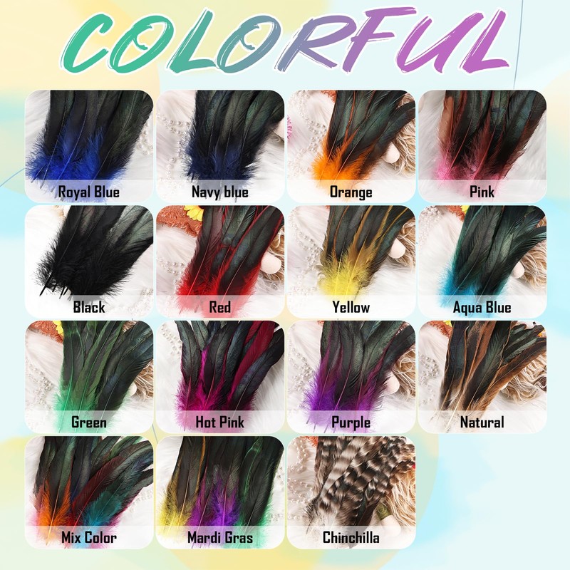 - 🐔More Colors More Styles:These Colorful Rooster tail feathers Bulk are Fantastic for all Kinds of Craft Projects.The pack Comes with 100 Feathers,Soft and Fluffy,The Colors are Bright and Varied,Adding a Lively Touch to Whatever You are Making.and Easy to Glue or Sew Onto Different Materials.Let Each of Your Crafts Showcase its Charm
