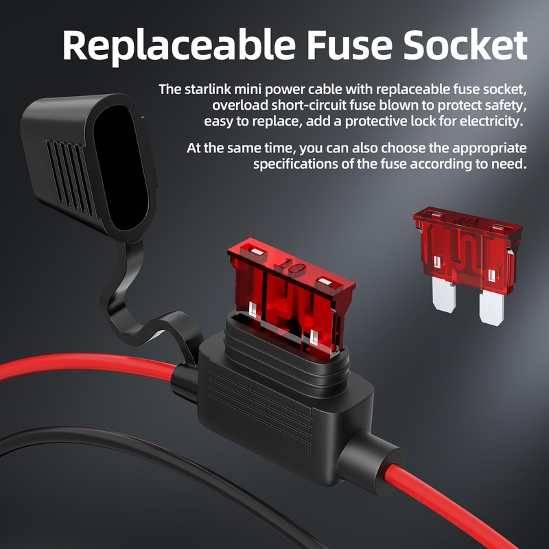 - Replaceable Fuse Socket: The starlink mini power cable with replaceable fuse socket, overload short-circuit fuse blown to protect safety, easy to replace, add a protective lock for electricity. At the same time, you can also choose the appropriate specifications of the fuse according to need.