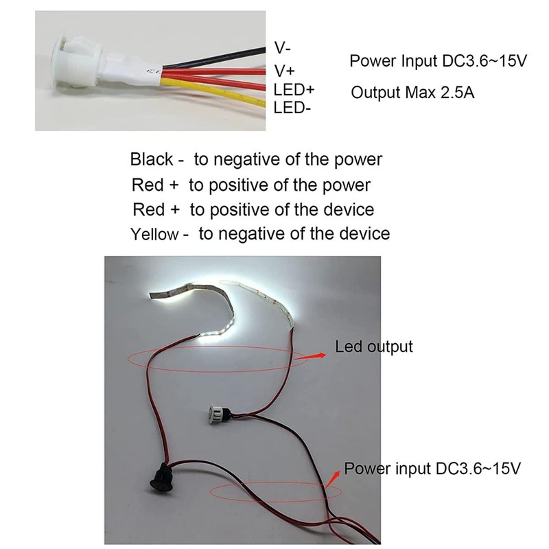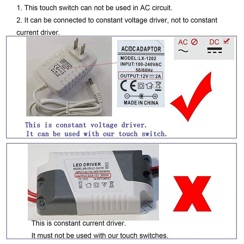 - This LED light dimmer switch is usually used as a DC12V switch and can also be used as a 3.6V to 15V LED touch switch. Please make sure your driver is a constant voltage driver as this dimmer switch can only be connected to a constant voltage driver. This LED dimmer switch cannot be connected to a constant current driver. You can check the picture to understand the difference between constant voltage driver and constant current driver.