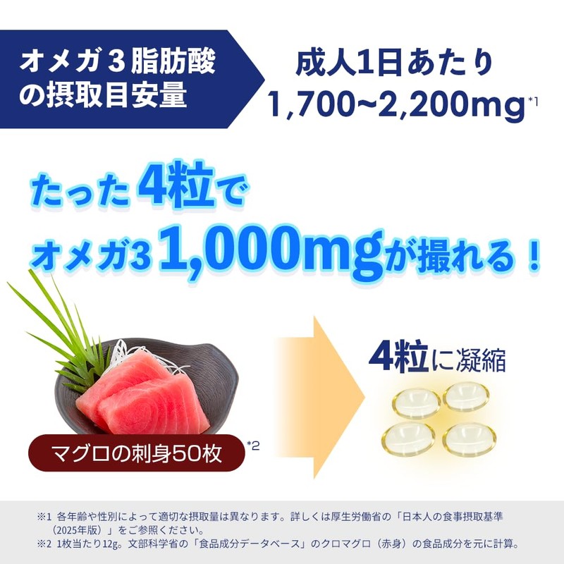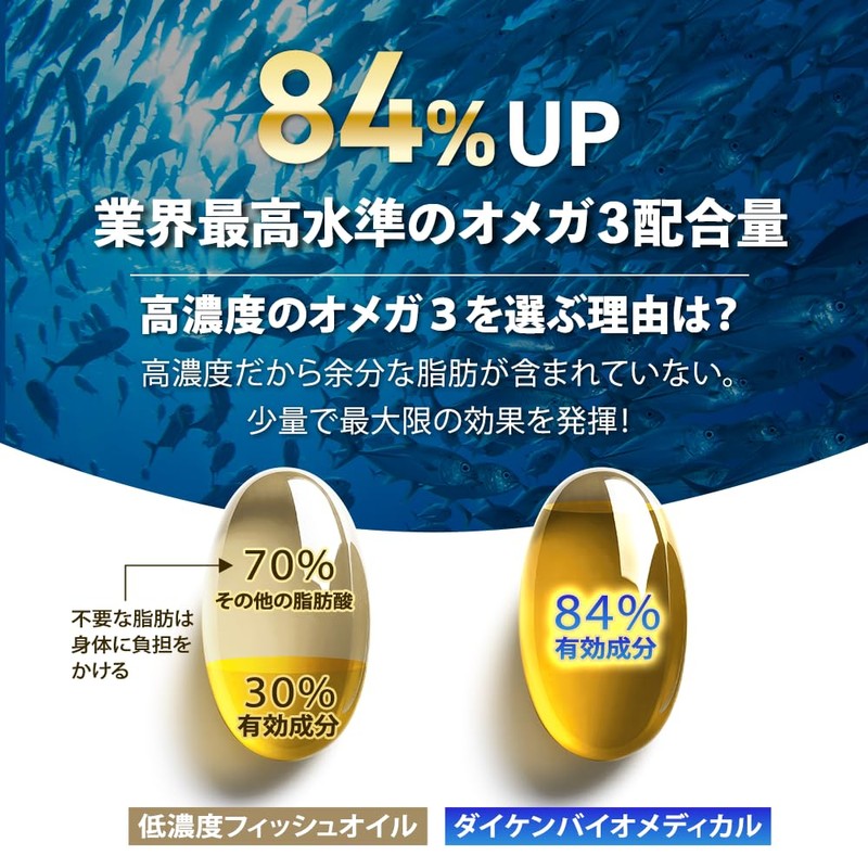 - 【高濃度オメガ3】オメガ3脂肪酸が約1,000mg配合(4粒あたり)。1粒あたりの栄養成分濃度84%以上と高濃度を実現。高濃度のフィッシュオイルにすることで、オメガ3脂肪酸以外の過剰な脂肪の摂取を防ぎ、体への負担も少なくなります。