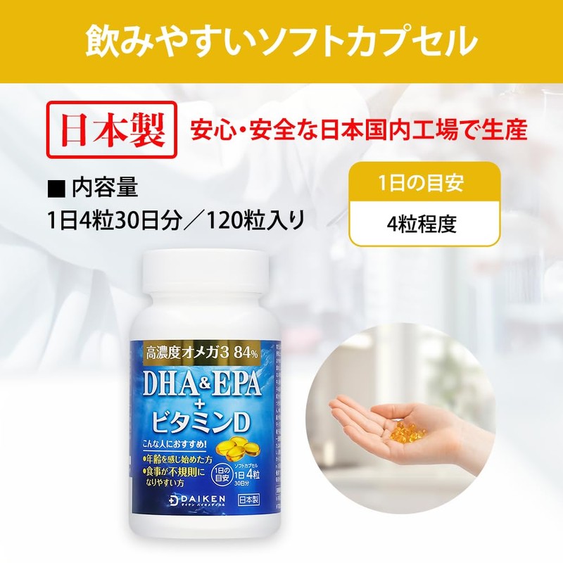 DAIKEN EPA, DHA & ビタミンD 120粒 (30日) 高濃度オメガ3 青魚 フィッシュオイル サプリメント 栄養機能食品 3個セット