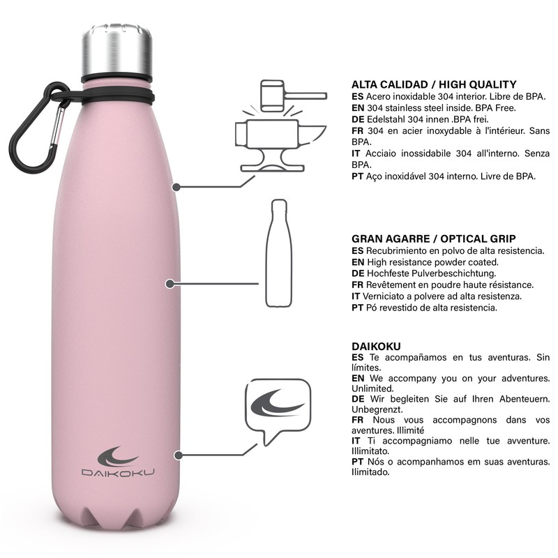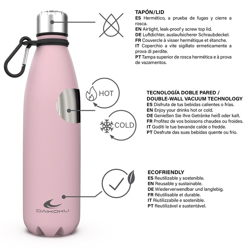 • Stainless steel water bottle: Stays hot and cold: The double-walled stainless steel vacuum insulation keeps the water hot for up to 12 hours and cold for up to 24 hours without sweat or condensation. The Daikoku thermos flask is a good companion on your journeys.