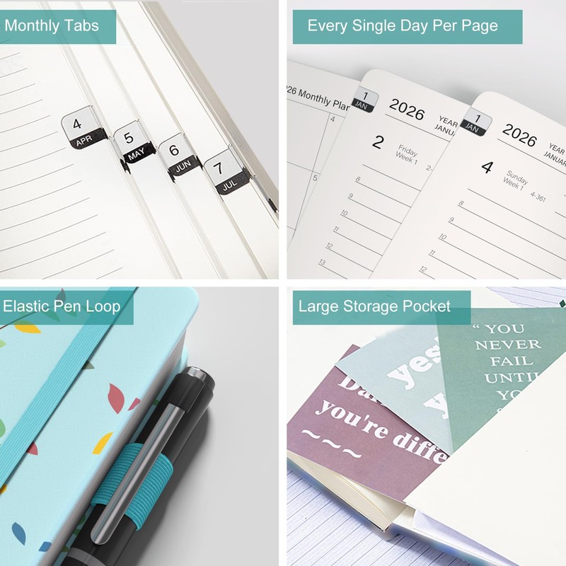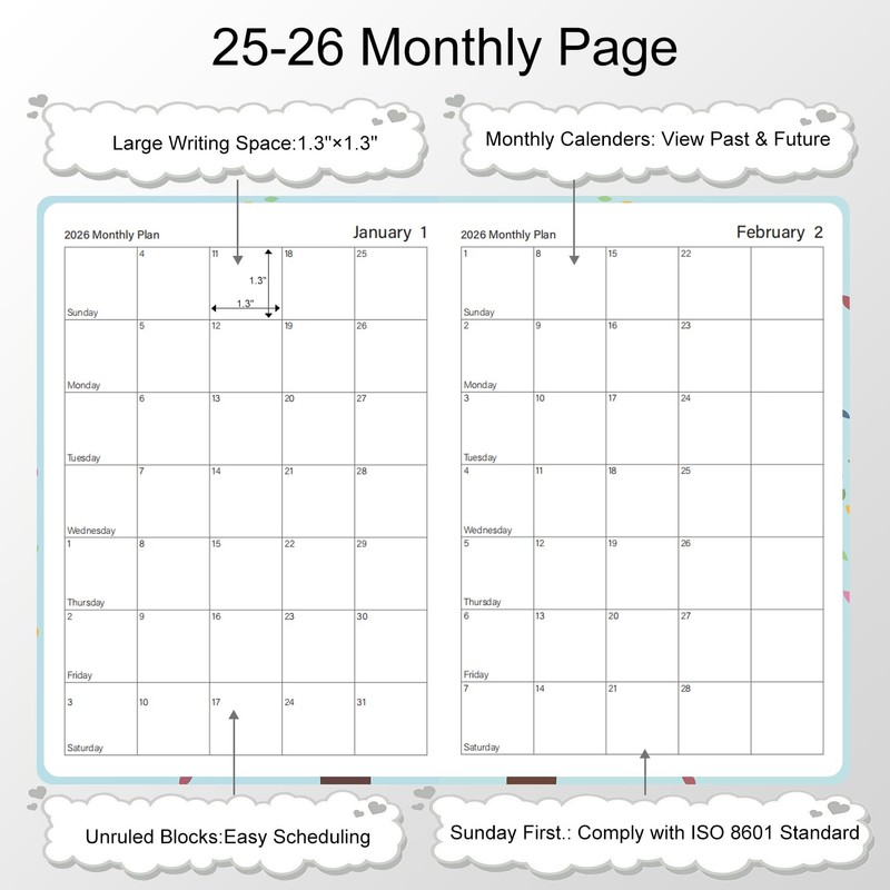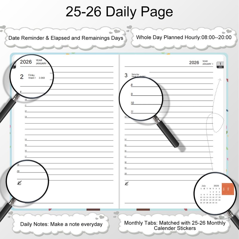 - 🌺 Functional Details - Thick paper + 2025-2026 diary 180° flat open +12 monthly diary sheets + 12 monthly print tabs & (2025. July - 2026.June) calender stickers for quick checking +The back inside pocket which can hold some cards + Elastic closure to keep diary closed + Pen loop + 1 Bookmarker + High quality PU cover + Perfect A5 size + Reference holidays + Blank notes pages + Contacts/Address pages