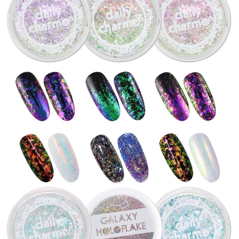 These gorgeous and versatile iridescent flakes can be used with polish or gel. For more vivid results, apply flakes over a dark base color.
