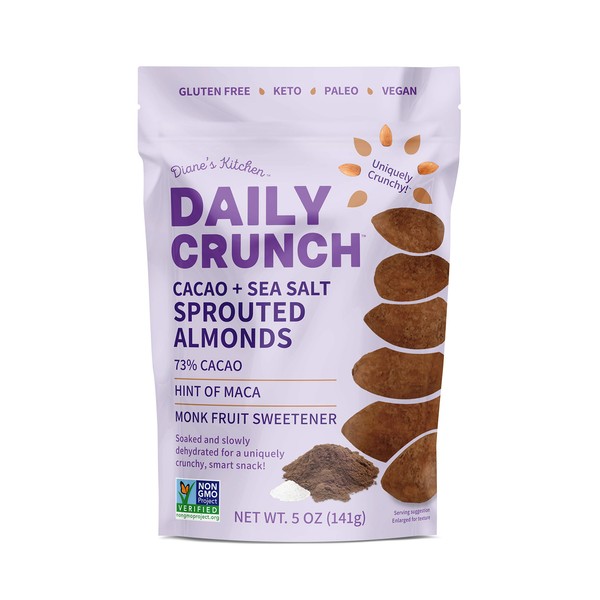 Daily Crunch Sprouted Almonds, Cacao and Sea Salt, 5 Ounce Resealable Bags, Pack of 2 - Sprouted and Dehydrated for a Unique Crunch, Keto Friendly, Non-GMO, Oil Free, Vegan, Healthy Snack