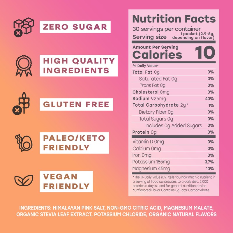 - Good-For-You Ingredients, Zero Sugar - Sourcing our ingredients from the highest quality suppliers, each packet remains sugar‑free, calorie‑free, vegan, non‑GMO, keto, and paleo friendly while keeping you revitalized.