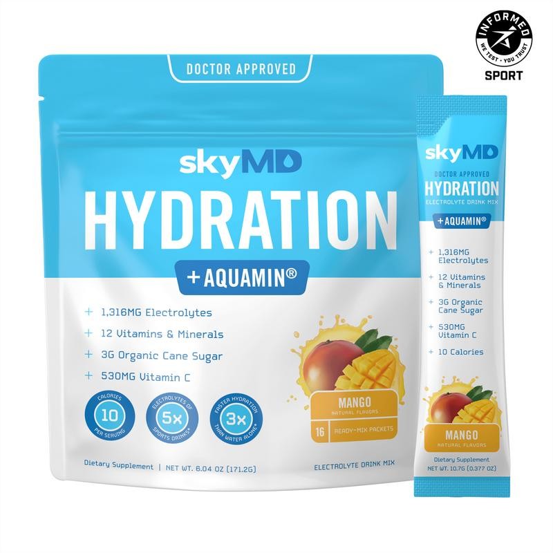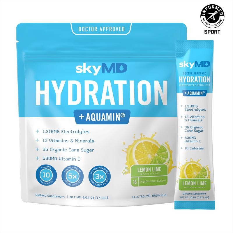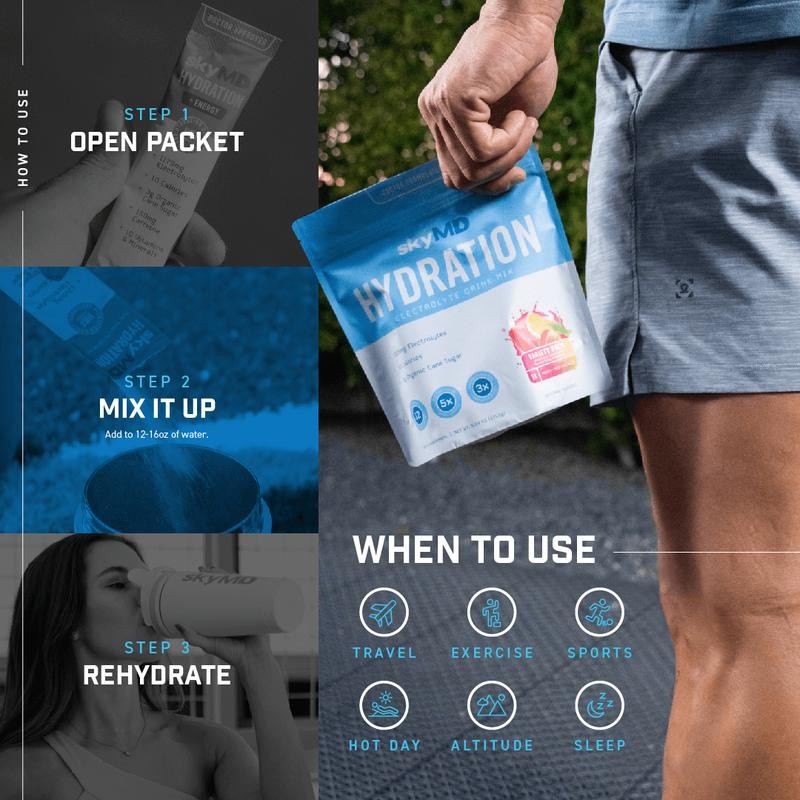 SkyMD Hydration is a delicious electrolyte drink mix that contains six key electrolytes as well as four B vitamins, six times your daily value of the antioxidant Vitamin C, and clinically-studied trace minerals for sustained energy and performance.