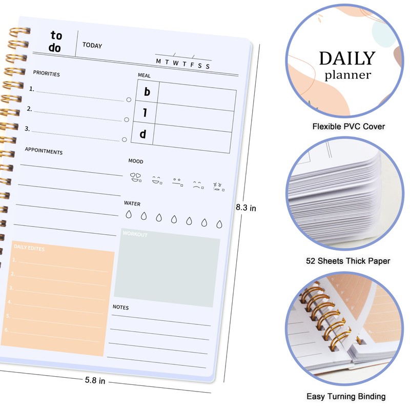 Daily Planner, Daily To Do List Notebook with Meal Organizor, Appointments for Home, Work, School,52 sheets, A5