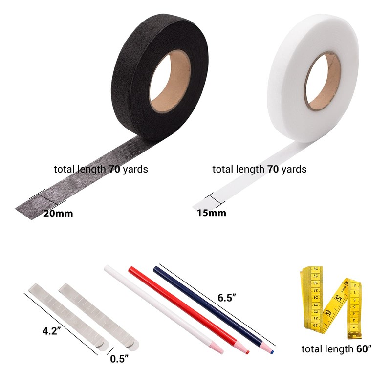 - 【Extra Practical Auxiliary Tools for You 】-Comes with 3 different colors of hem tape adhesive pencils(white, black, red), you can mark the fabric you need to mark-Easy to remove, and will not stain the fabric; 2pcs Hemming clips, and hem tape for clothes can hold the layers and make the cloths be easily smoothly modified. And also 1pcs 60" measure tape for you