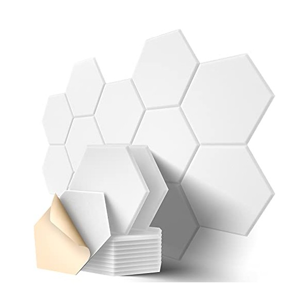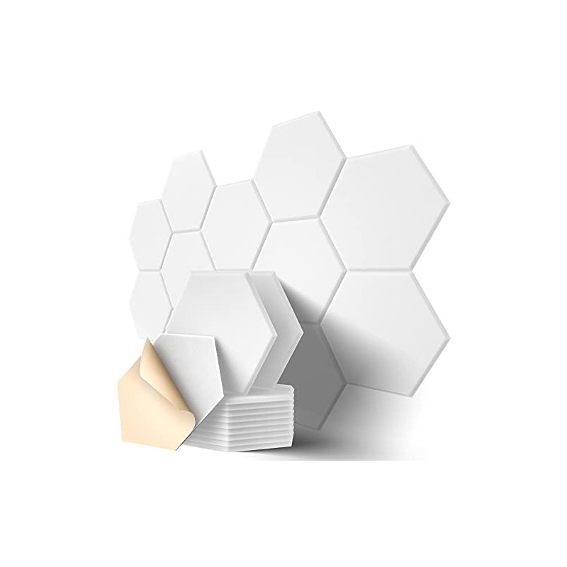 Dailycooper 12 Pack Self-adhesive Acoustic Panels 12" X 10" X 0.4" - Sound Proof Foam Panels with High Density, Stylish Hexagonal Design, Flame Resistant, Absorb Noise and Eliminate Echoes(White)