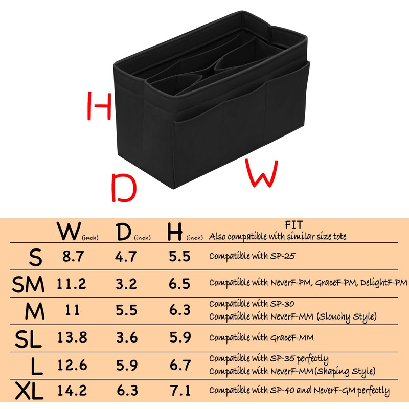 - 【PURSE INSERT FOR HANDBAGS】 S=8.7"W x 4.7"D x 5.5"H, compatible with SP-25, MINI & SMALL MJ TOTE. SM= 11.2"W x 3.2"D x 6.5"H, compatible with NeverF-PM, GraceF-PM, DelightF-PM. M=11"W x 5.5"D x 6.3"H, compatible with SP-30, MEDIUM MJ TOTE, with NeverF-MM(Slouchy Style). SL=13.8"W x 3.6"D x 5.9"H, compatible with GraceF-MM. L=12.6"W x 5.9"D x 6.7"H, compatible with SP-35, with NeverF-MM(Shaping Style). XL=14.2"W x 6.3"D x 7.1"H, compatible with SP-40, LARGE MJ TOTE BAG, and NeverF-GM.