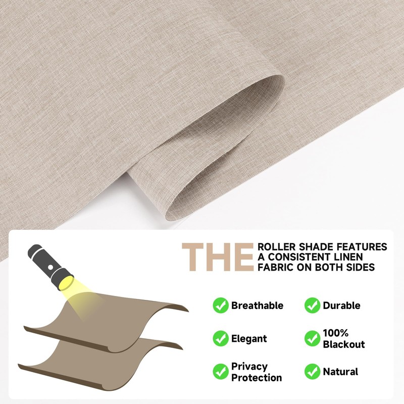 - [100% BLACKOUT ROLLER SHADES] : Made with natural linen fabric, these roller blinds combine breathability, comfort, and natural touch. These window blinds block light, insulate against temperature changes, reduce noise, and provide UV protection and privacy. Ideal for any season, window shades help protect furniture, lower energy costs and enhance your living space.