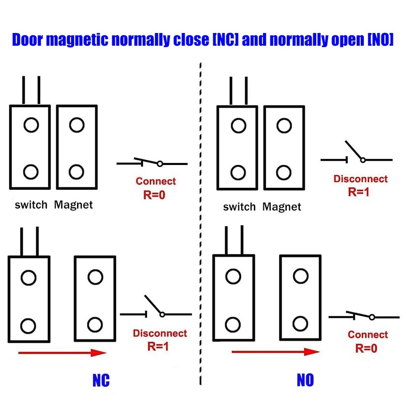 3.Switch Type: NC means Normally Closed:When the magnet together, the circuit is conductive( light on ); when the magnet separate, the circuit is not conductive ( light off ).