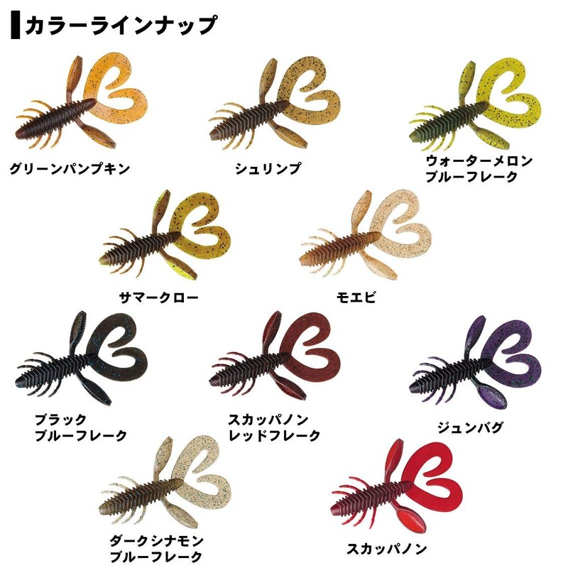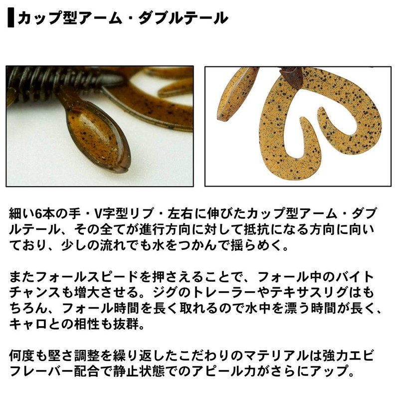 • Thin 6 hands, V-shaped ribs, extended cup arms and double tails, all are toward the direction of resistance against the direction of progression, so it grabs and shakes water even in a little flow. By pressing down the fall speed, you will also increase the chance of bites during the fall. Not only can it be used for jigs trailers and Texas rigging, but it can also be used for a longer fall time, so it can be used for a long time in the water, and it is also compatible with a caro. The material has been carefully adjusted repeatedly, and the powerful shrimp flavor is formulated to enhance the appeal of the static state