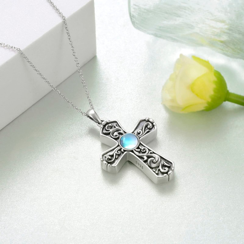 - Cross Urn Necklace Design:This necklace is an exquisite cross set with moon stones, symbolizing faith, hope and everlasting love. The intricate filigree design adds a touch of elegance and sophistication, making it the perfect memorial jewelry for women and men alike. Open the screw of the urn and you can put a small amount of ashes inside. If you don't want/have ashes, you can also pour perfume in or add crushed flowers, dirt, hair, sand and notepaper.