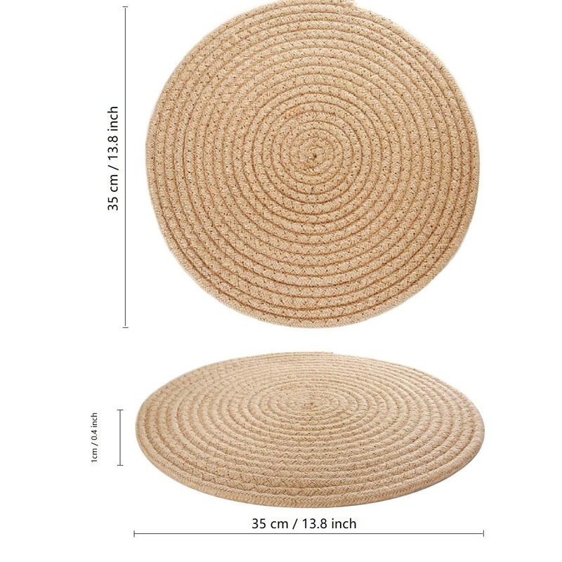 - Product Material: Cotton and Hemp rope. Set of 4, diameter 13.8 inch approx, use as round woven placemats, large trivets hot mat or potholders.