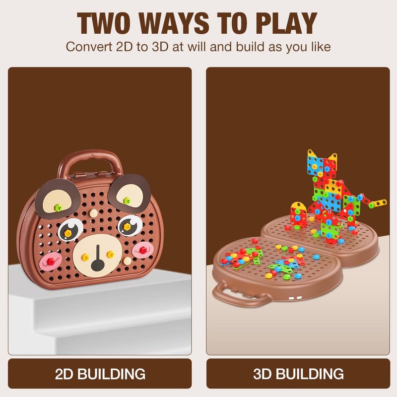 - [Ideal Gift] This magic Montessori play toolbox is loved by children because it is interesting and practical. If you are still worried about what gift to give your child, don’t hesitate, it will be the best choice! Bear Creativity Tool Box can bring you a lot of happy and happy times, and our creative mosaic puzzle toy with electric drill screw tool set also the best gift for children on holidays and birthdays.