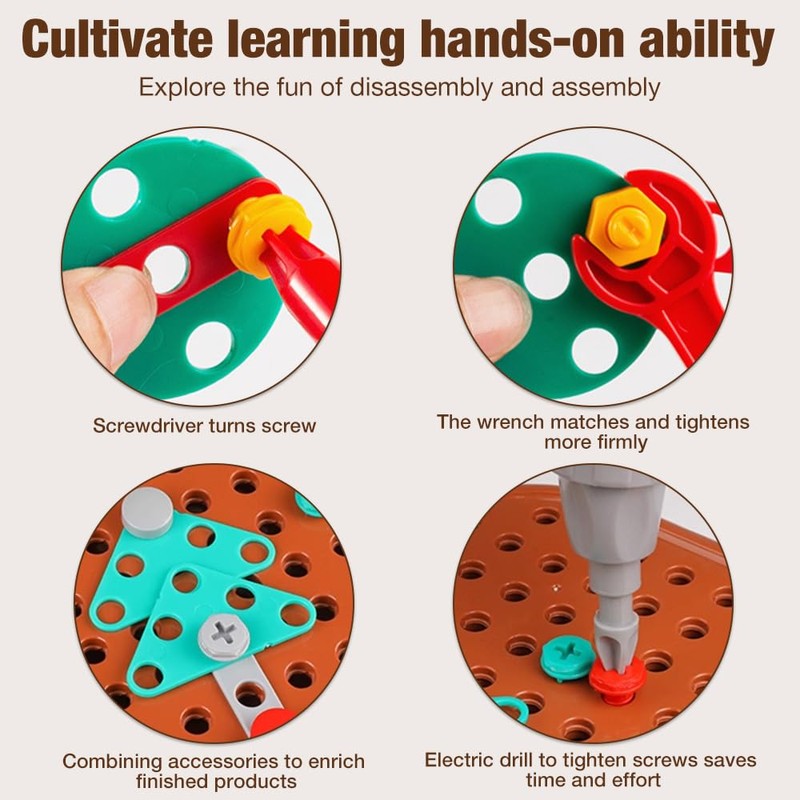 - [Learning Educational Toys] Creative mosaic puzzle toy with electric drill screw tool set combines learning and games to make learning very interesting; let your children improve spatial awareness, logical thinking ability, creativity and exercise hand-eye coordination through jigsaw puzzles; thereby improving your child's Cognitive ability, hands-on desire as well as observation and imagination, you will watch your child grow step by step through our magic Montessori play toolbox, which I think is very proud.