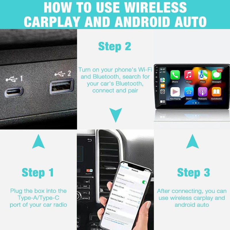 - Plug and Play: wireless CarPlay adapter easy connection, just three steps to set up. Simply pair it again and it easily switches between wireless Android car and wireless carplay depending on the paired device. The first connection takes 10 seconds and the automatic connection is completed in 5 seconds. It can connect to CarPlay precisely and quickly every time the vehicle is switched on, so you can enjoy comfort anytime and anywhere.