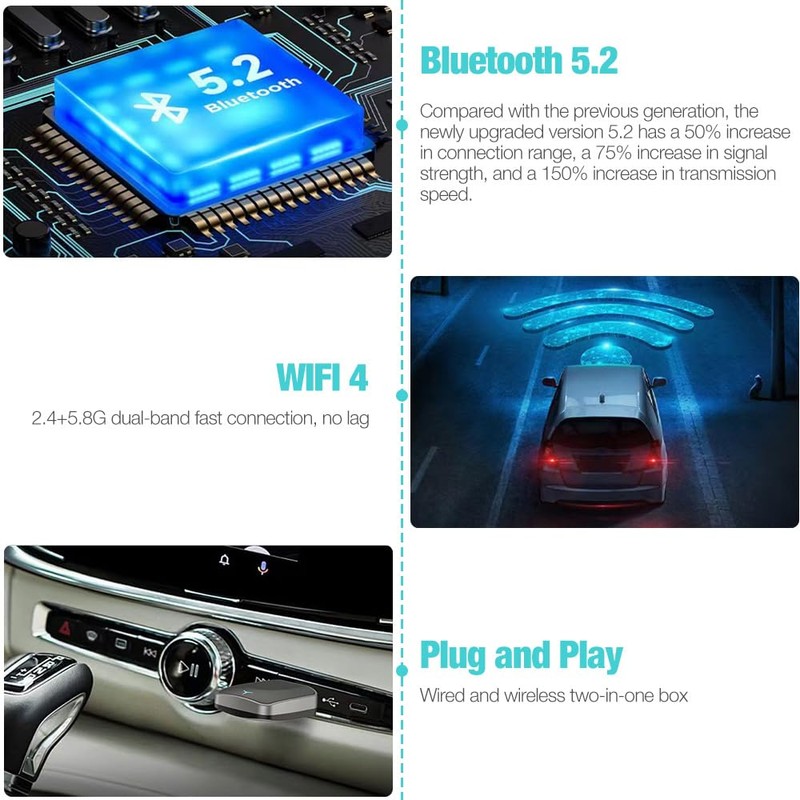- Wireless CarPlay Adapter: Wireless CarPlay Adapter 5.2 with 50% greater range, 75% higher signal strength and 150% higher transmission speed compared to the previous generation. WiFi 4, 2.4+5.8G dual frequency for fast and lag-free connection. The USB port is made of metal and thus ensures a strong, fast and stable connection.