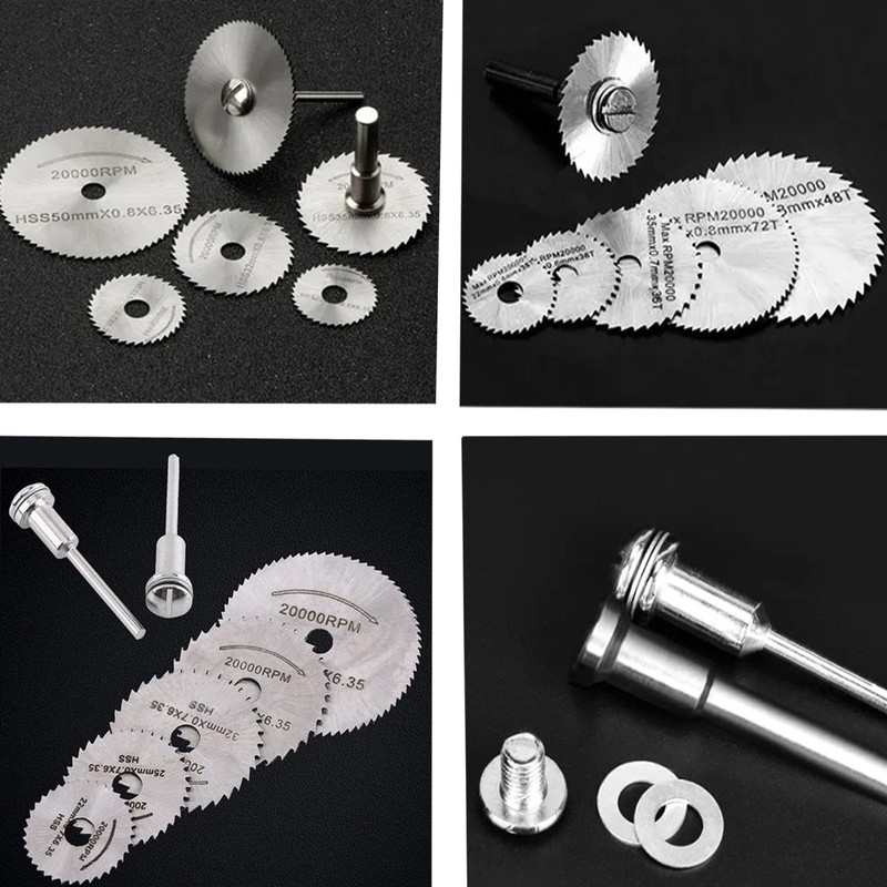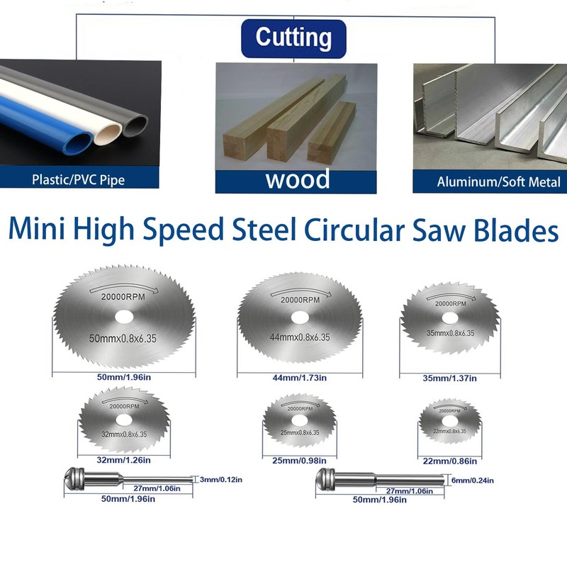 "Unmatched Quality: Heat-treated at temperatures between 1205–1215°C, these blades achieve a hardness range of 61–66.2HRC, ensuring superior abrasion resistance and extended lifespan. Wide Range of Uses: Designed to cut through various materials such as wood, plastic, glass, aluminum alloy, soft metals, and more, making them perfect for DIY projects, hobbies, and professional work. Detailed Specifications: Each disc measures 22mm, 25mm, 32mm, 35mm, 44mm, or 50mm in diameter, with an inner hole size of 6.35mm and a thickness of 0.8mm for precision cutting. Easy Installation: Equipped with both 1/8 inch (3mm) and 1/4 inch (6mm) shanks, these cutting wheels are compatible with a wide variety of rotary tools, air tools, and power grinders. Important Safety Tips: To avoid damage or injury, always ensure the mandrel is fully inserted, the screw is tightened, and the rotational speed does not exceed 20,000 RPM. Wear gloves and goggles for protection during use."