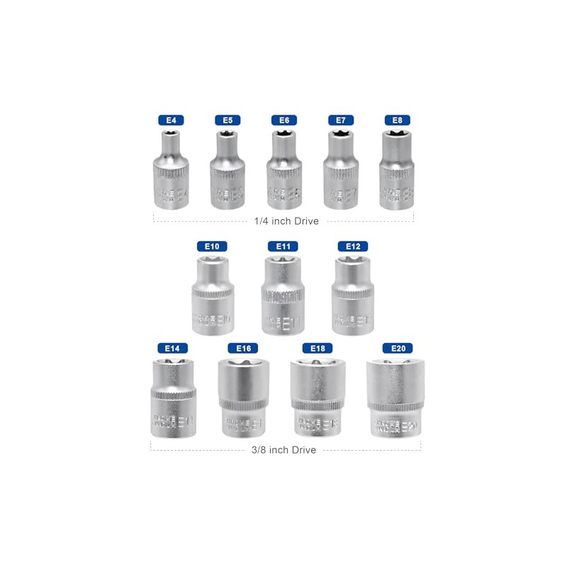 - Socket spanner inserts with 1/4 inch (6.3 mm) drive in sizes: E4, E5, E6, E7 and E8; 3/8 inch (10 mm) drive in the following sizes: E10, E11, E12, E14, E16, E18 and E20