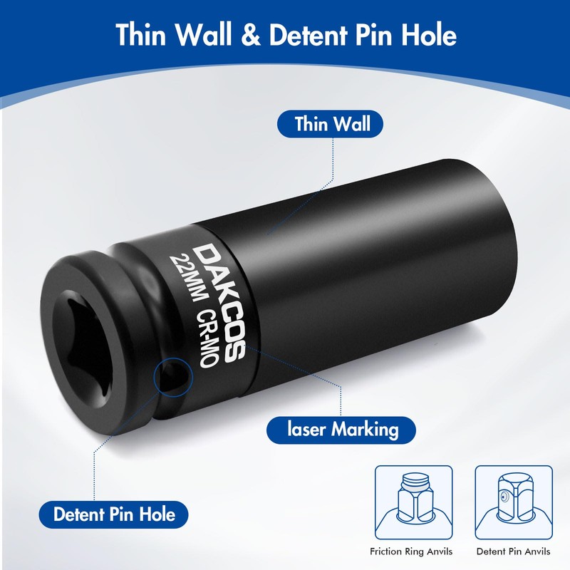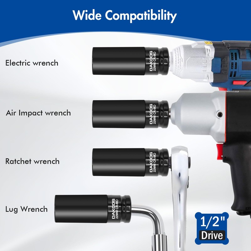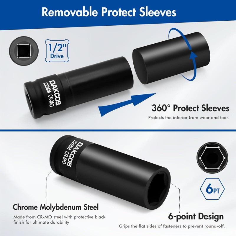 DAKCOS 22mm Impact Lug Nut Socket, 1/2 inch Drive, With Protective Sleeves,CR-MO