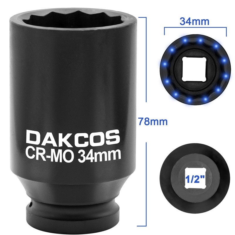 DAKCOS 34mm Socket 1/2" Drive 12 Ponit Impact Wrench Socket Drive Shaft Tool Power Socket, CR-MO Deep Socket