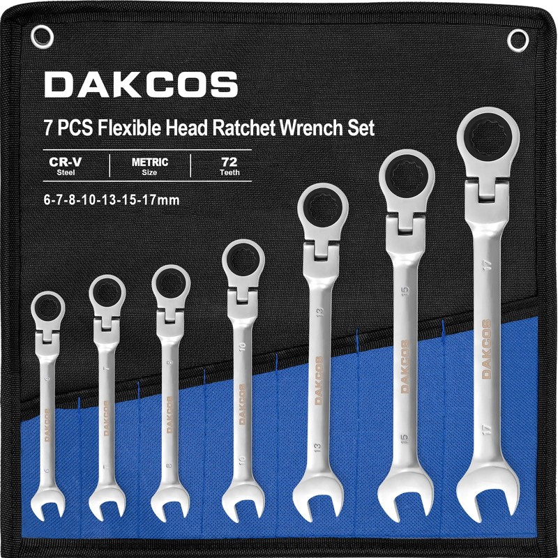 DAKCOS 7 Pieces Flexible Head Ratchet Wrench Set 6-17 mm Metric Combination Wrench Spanner Set CR-V