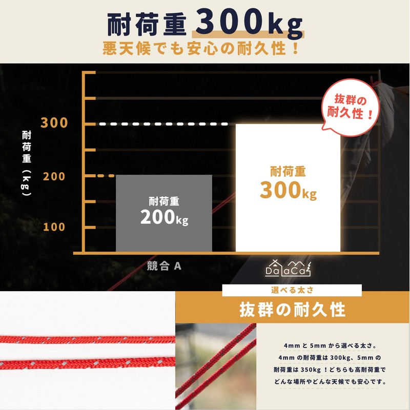 Specifications: Thickness: 0.16 (4 mm); Material: 1000D polyester; Reflective Material: With a stylish design and beautiful colors, it also goes well with tents and tarps such as Snow Peak and Coleman. The reflective material makes it highly visible at night, making it ideal for families with small children; Industry's Highest Level of Strength: The rope is made of 1000D polyester that is resistant to deterioration.Load capacity is over 661.4 lbs (300 kg) (measured by our company). The 0.16 in (4 mm) design of the DaLaCa rope can thoroughly secure your tent or tarp in any kind of bad weather or location