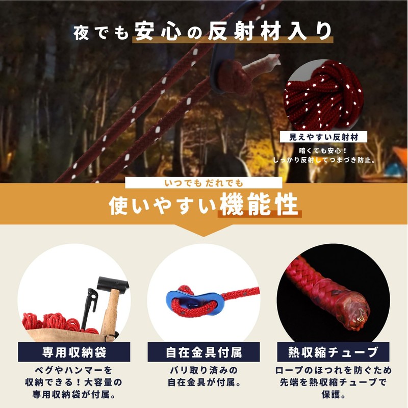 • Reflective Material: With a stylish design and beautiful colors, it also goes well with tents and tarps such as Snow Peak and Coleman. The reflective material makes it highly visible at night, making it ideal for families with small children